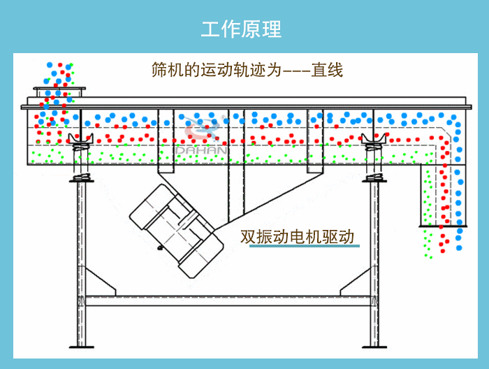 DZSF系列直線振動篩為雙振動電機驅(qū)動。當兩臺振動電機做同步、反向旋轉(zhuǎn)時,其偏心塊所產(chǎn)生的激振力在平行于電機軸線的方向相互抵消,在垂直于電機軸的方向疊為一合力,因此篩機的運動軌跡為一直線。兩電機軸相對篩面在垂直方向有一傾角,在激振力和物料自重力的合力作用下,物料在篩面上被拋起跳躍或向前作直線運動,從而達到對物料進行篩選和分級的目的。適用于粒度在0.074—5mm,含水量小于7%,無粘性的各種干式粉狀或顆粒狀物料的篩分。給料粒度不大于10mm。