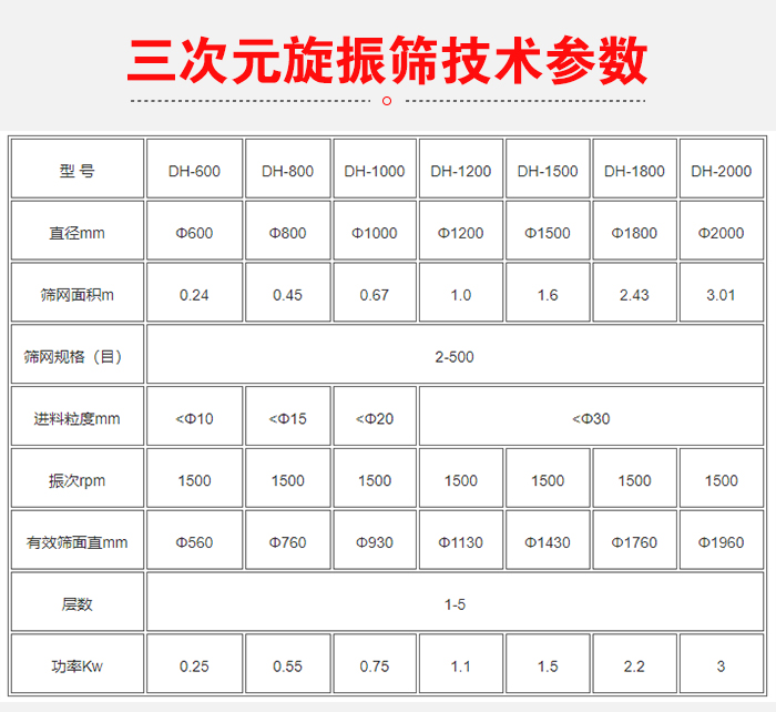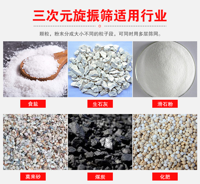 三次元旋振篩又稱旋振篩/三次元振動篩,是一種比較常見的篩分設備,外形為圓形,材質分為:碳鋼,不銹鋼,塑料等三種不同材質,針對于不同的物料進行選擇使用。
