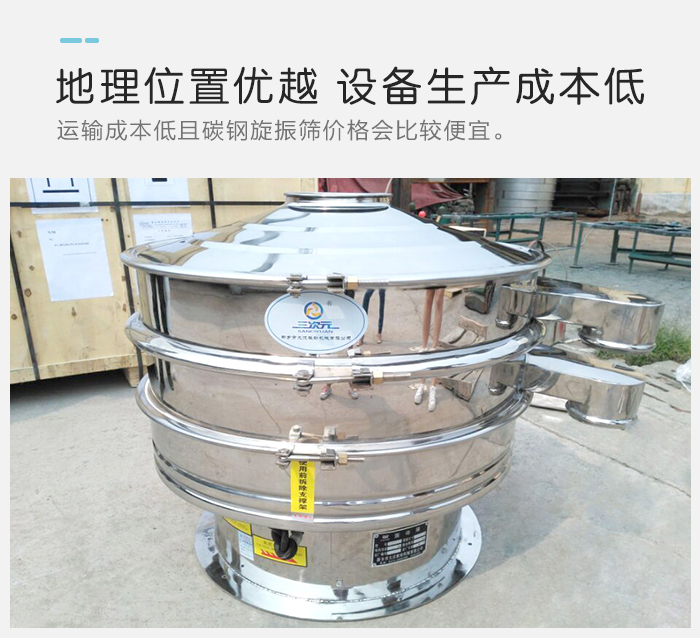 比較北上廣地區(qū)及國外廠家,河南新鄉(xiāng)地區(qū)的設(shè)備在原材料費用、人工費用等方面會更低,碳鋼旋振篩價格會比較便宜,而且運輸成本低,另外,國內(nèi)生產(chǎn)廠家數(shù)量較多,市場存在競爭性,設(shè)備的定價不會太高。