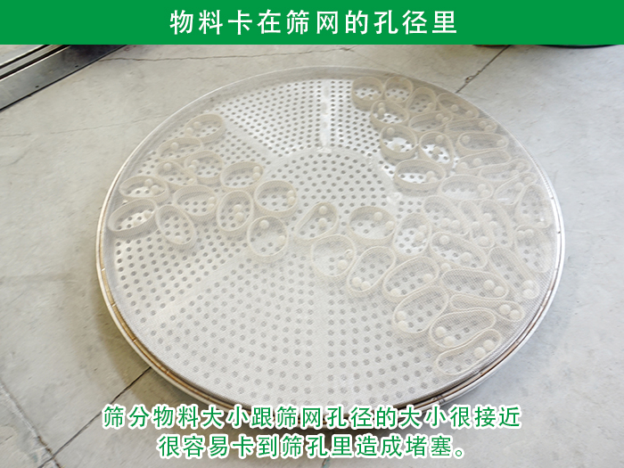 由于篩分的物料大小跟篩網(wǎng)的孔徑的大小很接近,而且形狀不規(guī)則,所以很容易卡到篩孔里造成堵塞。